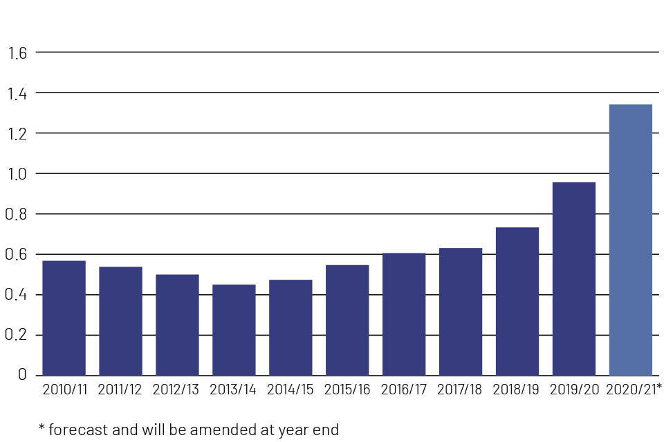 nearly 600 million in 2010/11, down to 450 million in 2013/14, rising to 1.35 billion in 2020/21