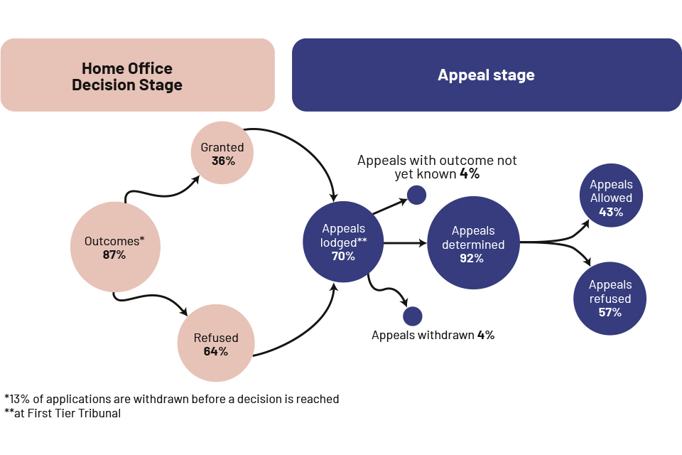 87% have outcome, 36% grant, 64% refuse. 70% lodge appeal. 92% of appeals determined. 43% allowed, 57% refused.