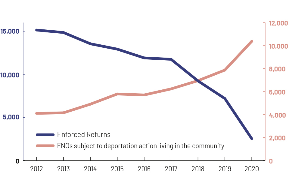 FNO returns have also fallen in recent years, from 6,437 in 2016 to 5,118 in 2019.[footnote 29] There are now over 10,000 Foreign National Offenders, many of whom have committed serious offences, at liberty in the UK.[footnote 30] There are also 42,000 failed asylum seekers who have not left the UK.[footnote 31]