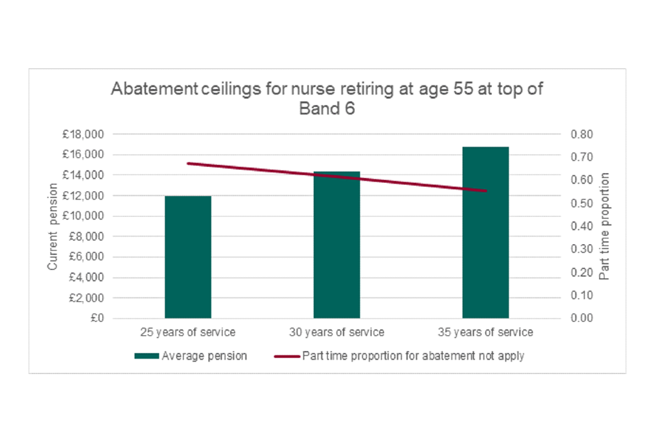The above graph shows the average pension size for 3 example SCS nurses with 25, 30 and 35 years of pension membership at retirement. These members will, on average, accrue annual pensions of £12,000, £14,400 and £16,800 respectively, payable at age 55. The graph also shows the percentage of FTE that each example member could work if they returned to work after retirement while in receipt of pension benefits. All members can work at least half-time when in receipt of benefits before abatement applies.