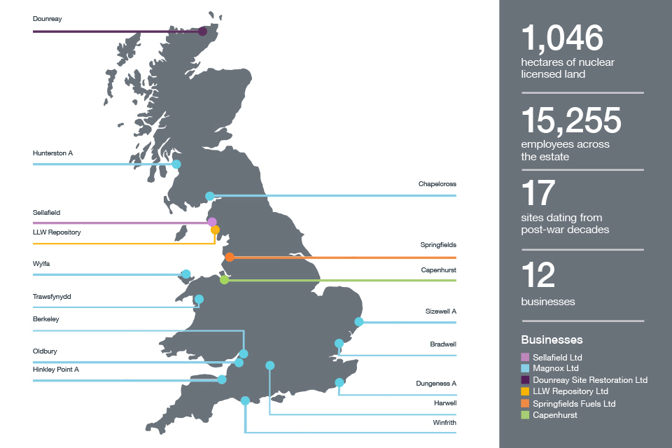 We are responsible for decommissioning 17 nuclear sites spread across England, Wales and Scotland, some dating back to the 1940s, plus associated liabilities and assets. This includes the first generation of Magnox power stations, various research and fuel facilities and our largest, most complex site, Sellafield.
