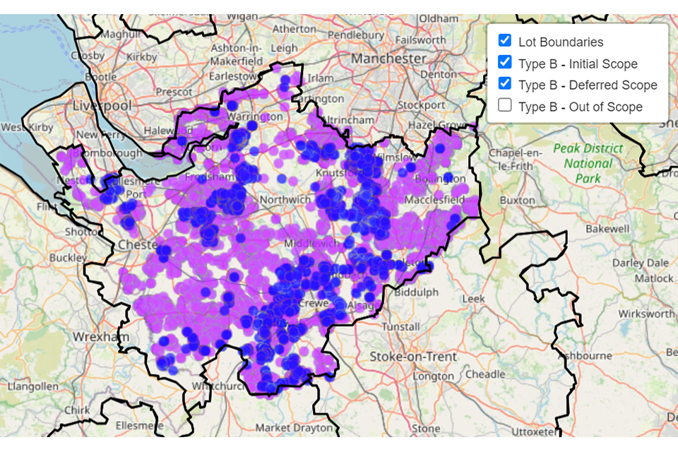 The procurement type selected for Cheshire (Lot 17), following engagement with market and other stakeholders, is anticipated to be a single Type B regional supplier procurement. A premises-level map detailing the proposed IA can be found in Annex B.