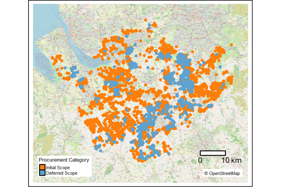 This map is accompanied by a list of UPRNs that fall within the IA, clearly demarcating which premises are within the ‘Initial’ or ‘Deferred’ Scope which suppliers can request via Atamis. If you are unable to access Atamis, please contact the Supplier Mailbox bduksuppliers@dcms.gov.uk.