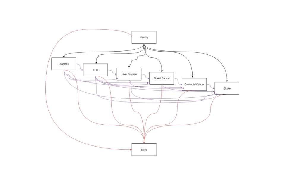 The new model utilises Markov modelling to calculate the transitions of the population between states, where states are defined as healthy, having a condition (where each condition is a separate state), or deceased. The Markov modelling was handled by the heemod package in R. The probabilities of being in a state are used as inputs into the heemod package, which can then simulate how the states will develop over time, starting the model with 100% of the population in the healthy state.
