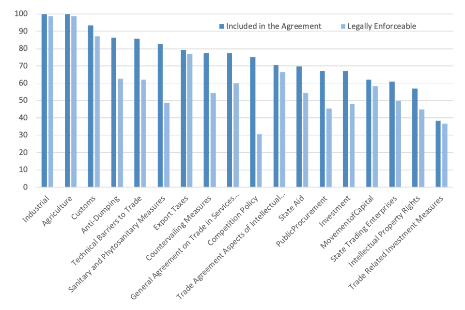 The provisions included in free trade agreements (FTAs) vary across agreements. The World Bank has created a database that summarises the content of all FTAs that were in force and notified to the World Trade Organization (WTO) as of 2015. [footnote 1] It covers 279 FTAs. For each agreement, the commitments are classified in one of 52 categories (outlined below) and distinguished according to whether or not they are legally enforceable.