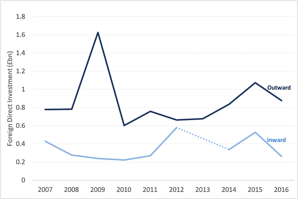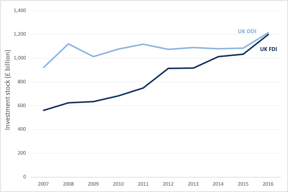 Office for National Statistics, Foreign Direct Investment Involving UK Companies, 2016. Outward investment. ↩