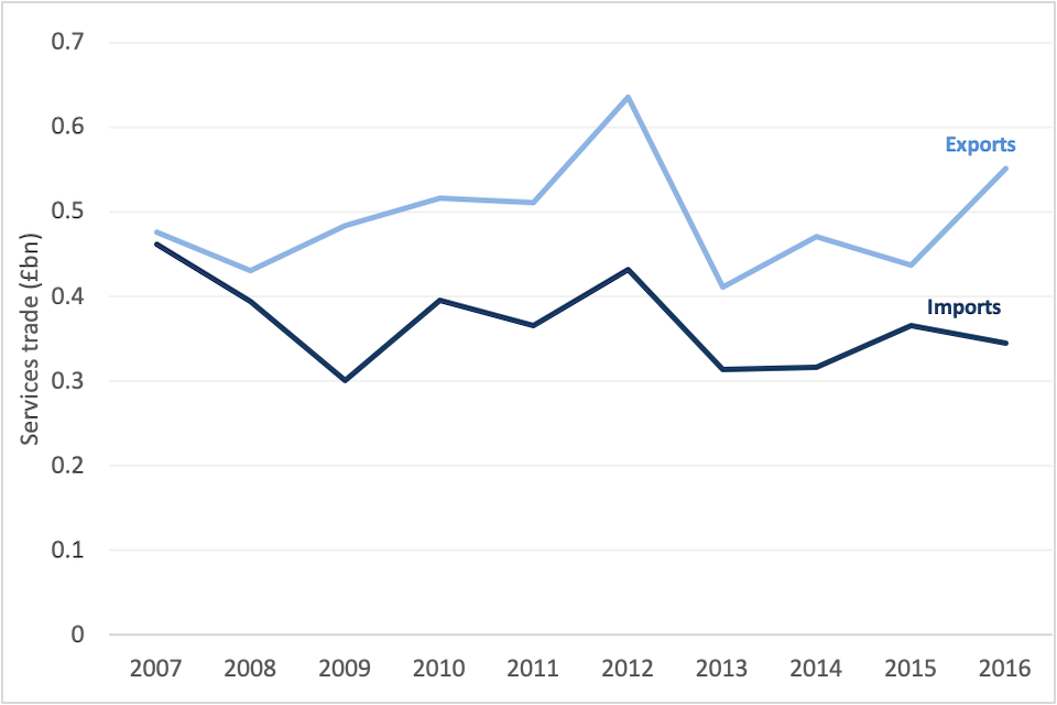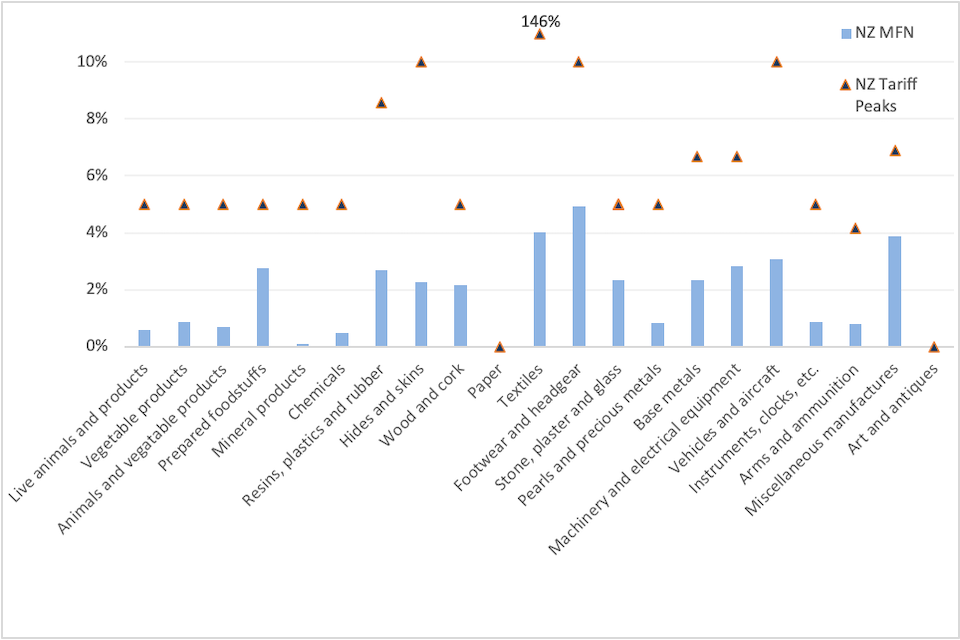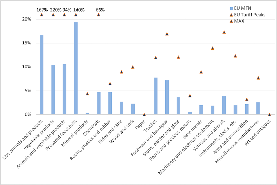 Tariff average calculated using simple average of applied tariffs in 2016, ad-valorem equivalent of specific taxes. Note: Specific taxes are taxes applied per unit of good sold rather than as a proportion of overall value. ‘Ad valorem equivalents’ convert these specific taxes (such as £5 per kilo) into the tariff rate that would be payable if items taxed according to its value. Source: WITS database; EU tariff schedule used for the UK ↩
