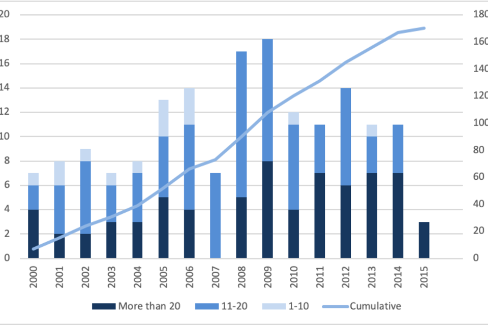 Chart 1: Number of bilateral trade agreements, by the number of provisions covered (2000-2015)