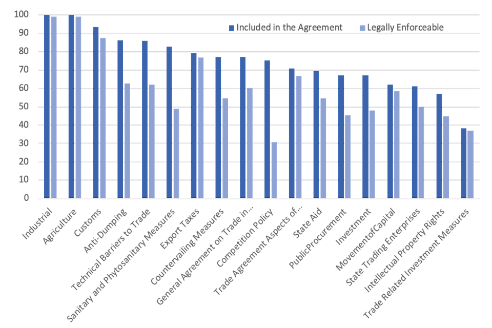 The provisions included in free trade agreements (FTAs) vary across agreements. The World Bank has created a database that summarises the content of all FTAs that were in force and notified to the World Trade Organisation (WTO) as of 2015.[footnote 1] It covers 279 FTAs. For each agreement, the commitments are classified in one of 52 categories (outlined below) and distinguished according to whether or not they are legally enforceable.
