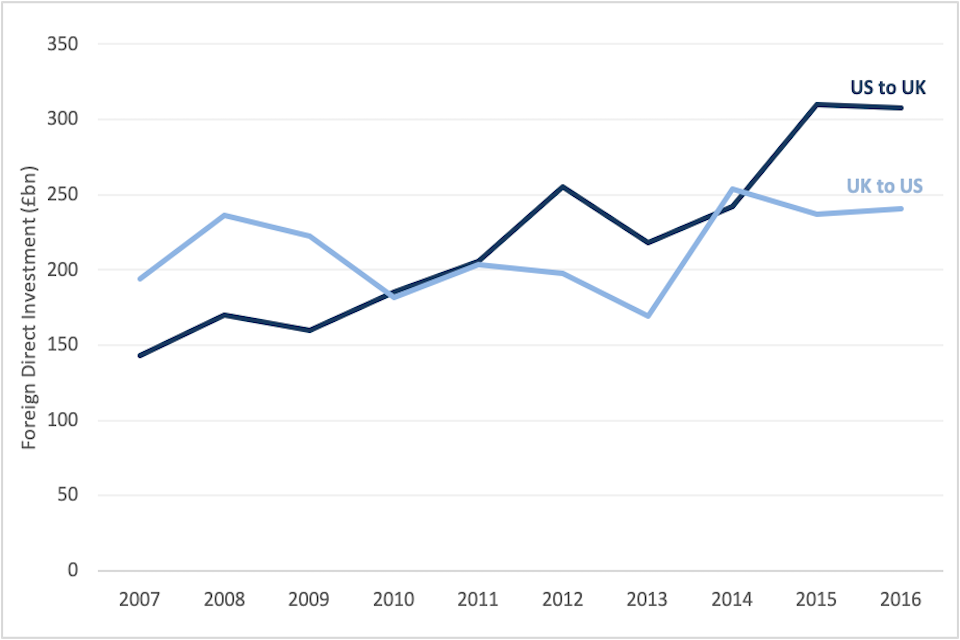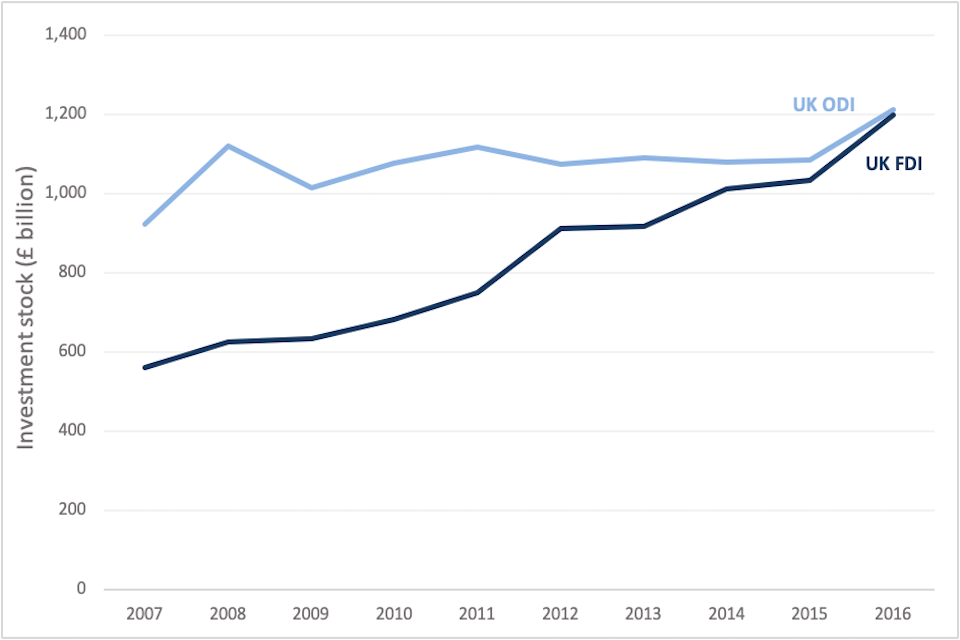 Office for National Statistics, Foreign Direct Investment Involving UK Companies, 2016. Inward and Outward investment. ↩