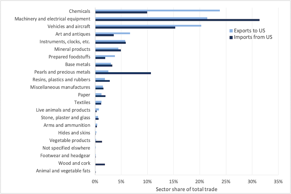 ‘Ad valorem equivalents’ convert these specific taxes (e.g. £5 per kilo) into the tariff rate that would be payable if items taxed according to its value. Source: WITS database; EU tariff schedule used for the UK ↩