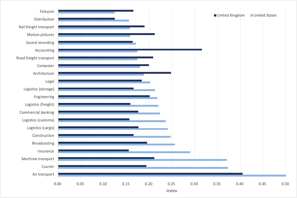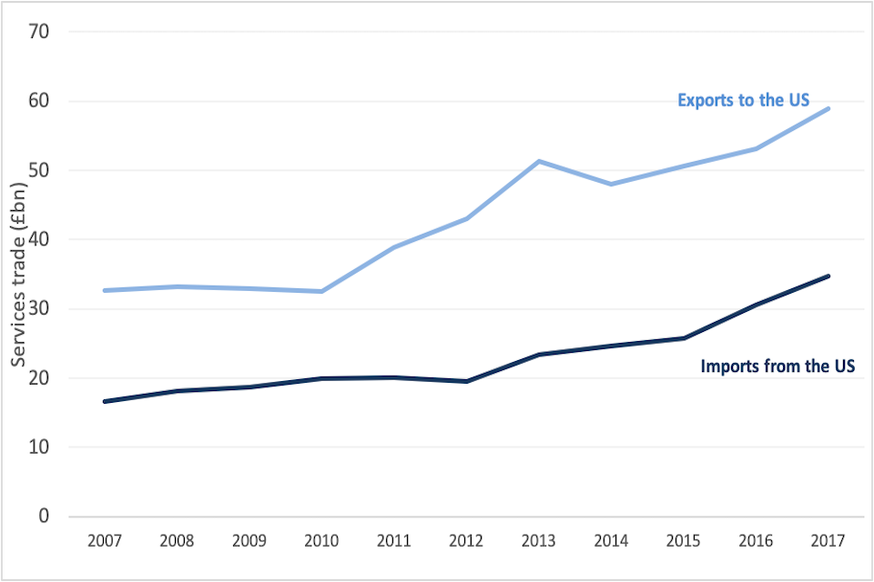 Asymmetries exist in trade in UK-US services trade data where both countries report a trade surplus with each other. According to the ONS, in 2016 the UK reported a trade in services surplus with the US of £22.5 billion, while the US reported a trade in services surplus of £10.4 billion with the UK. See ONS asymmetries in trade data - diving deeper into UK bilateral trade data and understanding asymmetries between BEA’s and partner countries’ trade statistics for an explanation. ↩
