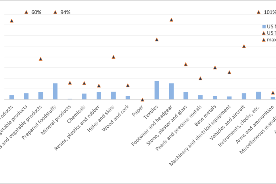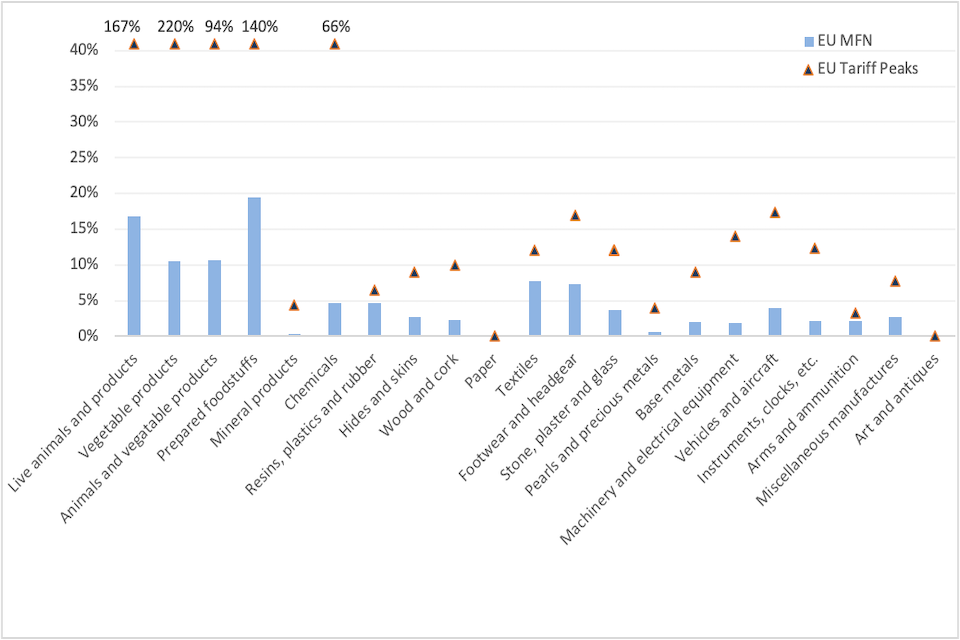 Tariff average calculated using simple average of applied tariffs in 2016. Ad-valorem equivalents calculated for specific taxes. Note: Specific taxes are taxes applied per unit of good sold rather than as a proportion of overall value. ‘Ad valorem equivalents’ convert these specific taxes (e.g. £5 per kilo) into the tariff rate that would be payable if items taxed according to its value. Source: WITS database; EU tariff schedule used for the UK ↩