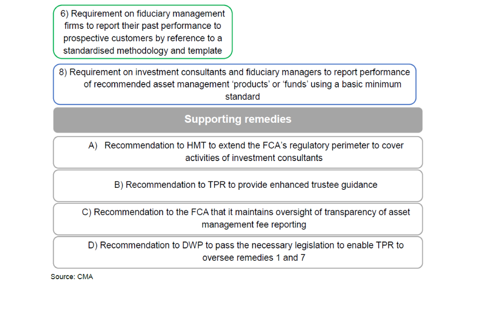 Diagram showing the Competition and Markets Authority's supporting remedies, including a recommendation to HM Treasury to extend the Financial Conduct Authority's regulatory perimiter to cover activities of investment consultants.
