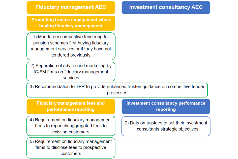 Diagram showing the Competition and Markets Authority's remedies and recommendations, including mandatory competitive tendering for pension schemes first buying fiduciary management services or if they have not tendered previously.