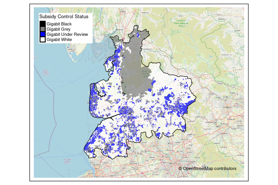 During the PR stage for Lancashire (Lot 9), BDUK sought responses from the market and other stakeholders to validate the Annex A Subsidy Control map (showing Gigabit White, Grey, Black and Under Review determinations).