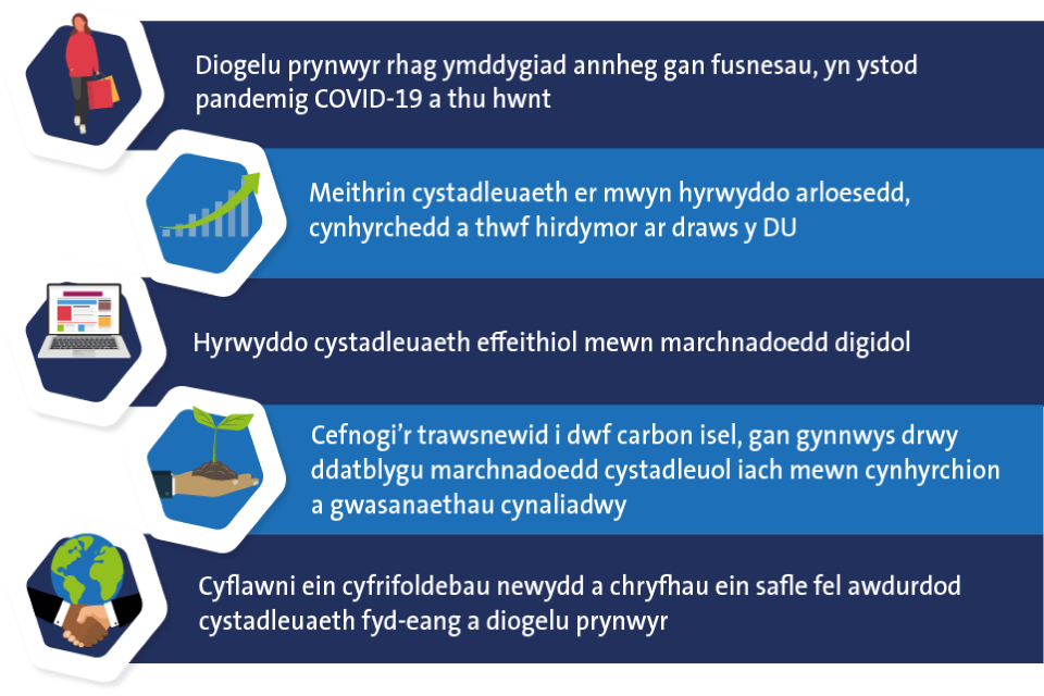 Mae’r ddelwedd uchod yn dangos ein themâu allweddol fel a ganlyn: Amddiffyn Defnyddwyr; Meithrin cystadleuaeth i hyrwyddo twf tymor hir ledled y DU; Hyrwyddo cystadleuaeth mewn marchnadoedd digidol; Cefnogi twf carbon isel; Cyflawni ein cyfrifoldebau newydd