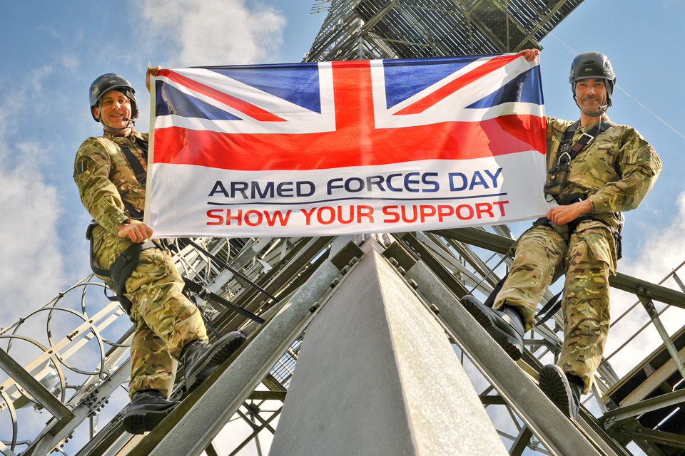 Flight Sergeant Martyn Clayton and Corporal 'Bod' Davies of the Royal Air Force Aerial Erector School hold up the Armed Forces Day flag (stock image) [Picture: Gordon Elias, Crown copyright]