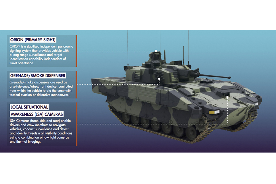 Amongst the 589 packages of equipment produced will be the Primary Sight, which will enable commanders to maintain a 360° view of their surroundings. It includes wide-area search-and-detect capability that automatically locates and tracks potential targets from their thermal signature, alerting the vehicle’s crew to their presence.