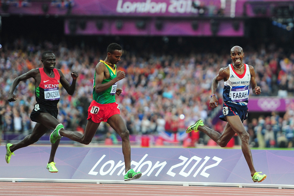 Mo Farah laimi vyrų 5000 metrų bėgimo finalą. Nuotrauka: Adam Davy/PAWire.