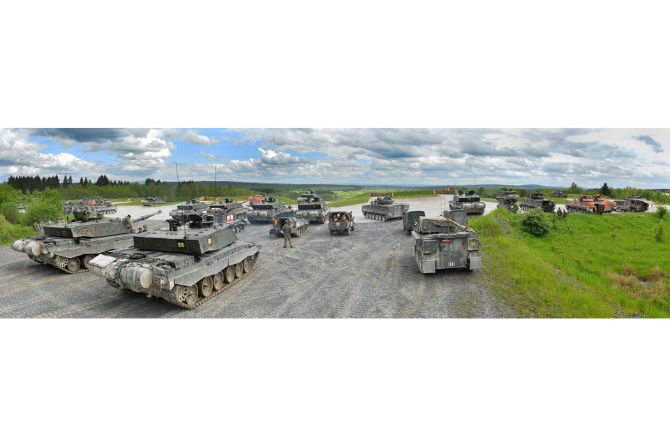 A panoramic view of British Challenger 2 main battle tanks and Warrior infantry fighting vehicles on the live firing range at Grafenwöhr [Picture: Corporal Wes Calder RLC, Crown copyright]