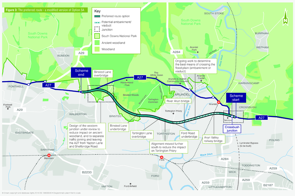 The preferred route – a variation of Option 5a put forward at last year’s consultation – strikes the right balance between creating vital new road capacity and protecting the special environment and cultural heritage in and around Arundel.