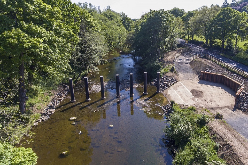 To reduce the risk of flooding from the River Wansbeck, in-town defences were completed first, followed by the large upstream storage area at Mitford, which has already operated to protect the community. This year, tree poles were installed into the river near to Lowford Bridge to prevent large debris from reaching the town centre.