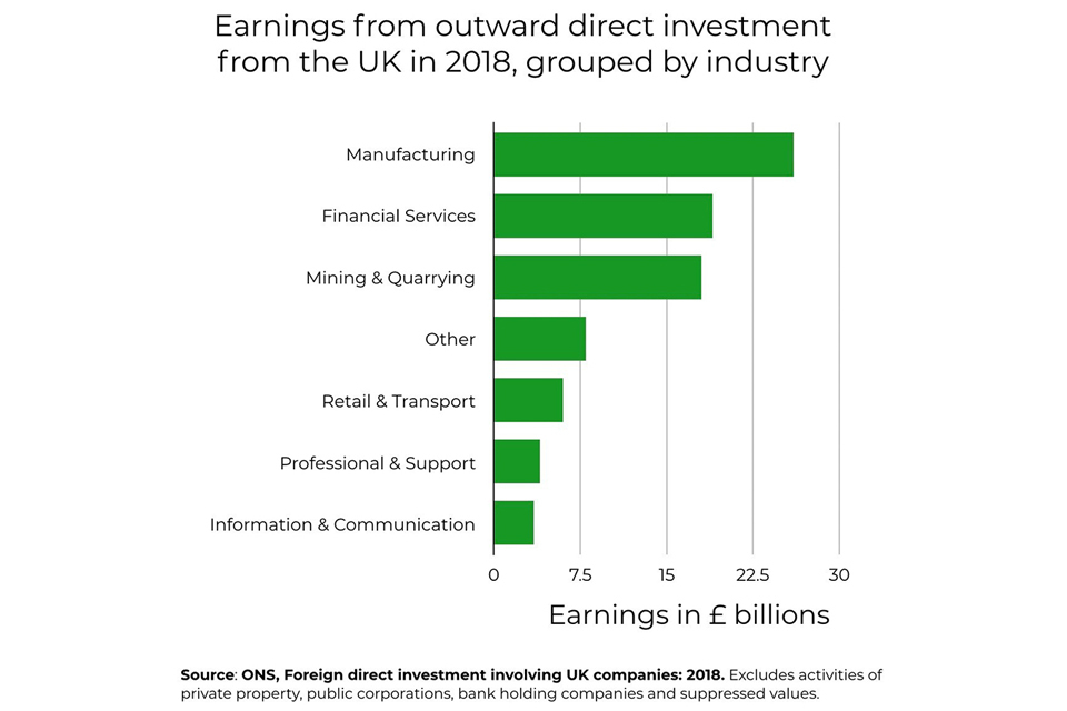 Earnings from outward direct investment from the UK in 2018, grouped by industry. Manufacturing is top, followed by financial services and mining and quarrying