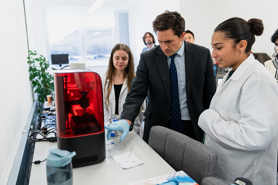 Minister for Veterans' Affairs Johnny Mercer, speaks to staff at NuTissu, a company whose project was funded through the Veterans Health Innovation Fund