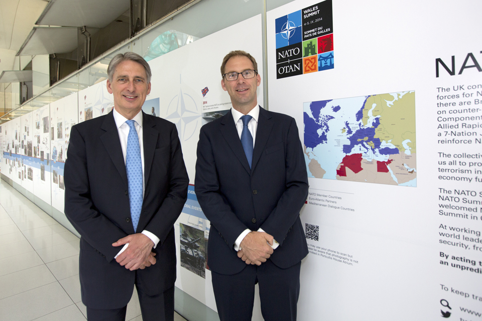 Philip Hammond (left) with Tobias Ellwood MP, Parliamentary Adviser to the Prime Minister on the NATO Summit (right), at the NATO 65-year timeline photographic display at Portcullis House in London [Picture: Petty Officer Airman (Photographer) Owen Cooban, Crown copyright]