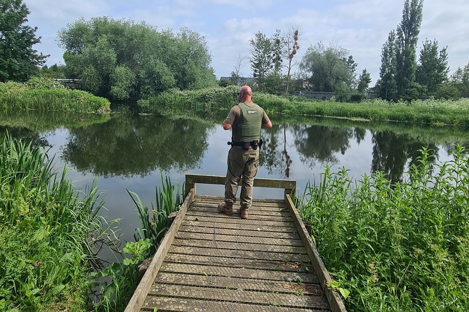 Environment Agency fisheries enforcement officer on a river bank in Essex.