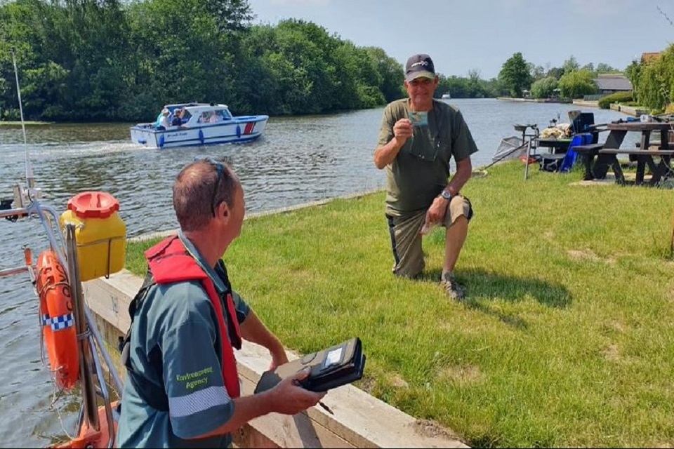 Environment Agency fisheries enforcement officer checking an angler's rod licence.