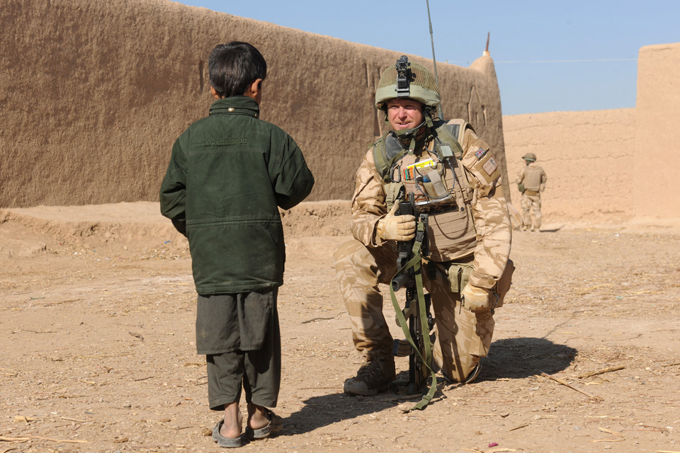 A member of the 1st Battalion Coldstream Guards talks to one of the local children during a patrol around Kopak near Babaji (library image) [Picture: Sergeant Keith Cotton RLC, Crown copyright]