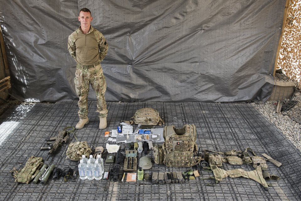 Kingsman Sam Taylor, from 2nd Battalion The Duke of Lancaster's Regiment, with the kit he would carry on an average 24-hour patrol [Picture: Imperial War Museum]