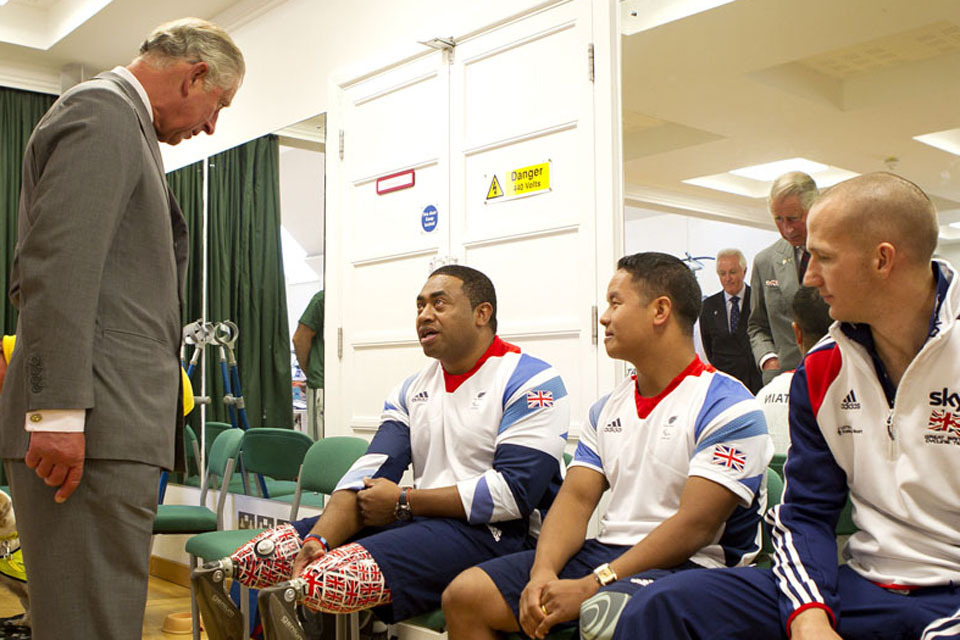 His Royal Highness The Prince of Wales talking to Paralympians Private Derek Derenalagi and Lance Corporal Netra Rana in the new Jubilee Rehabilitation Complex at Headley Court [Picture: Senior Aircraftman Stewart Paterson, Crown Copyright/MOD 2012]