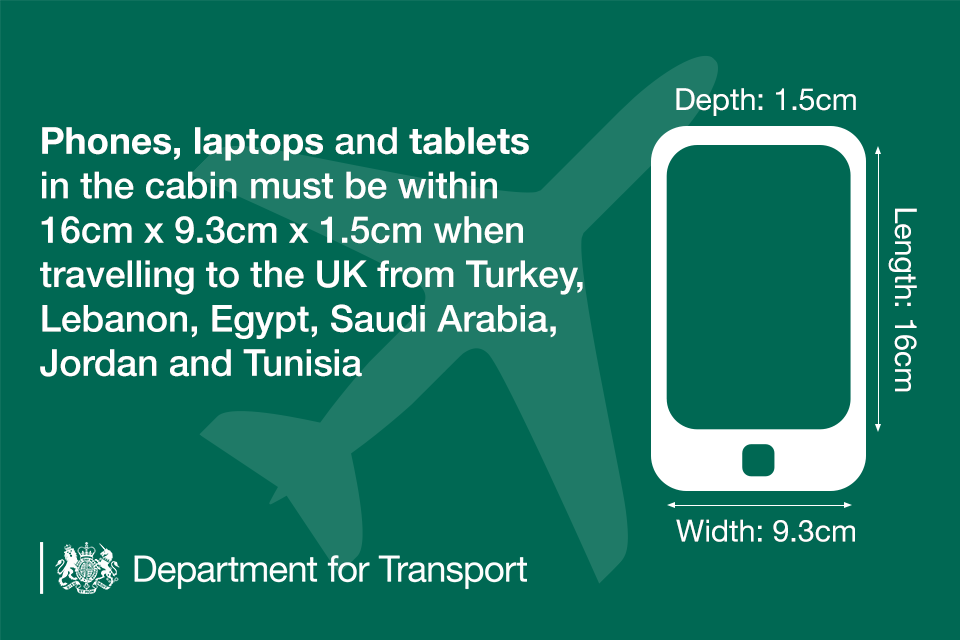 Large phones, laptops and tablets not allowed in the cabin on flights to the UK from Turkey, Lebanon, Egypt, Saudi Arabia, Jordan and Tunisia.