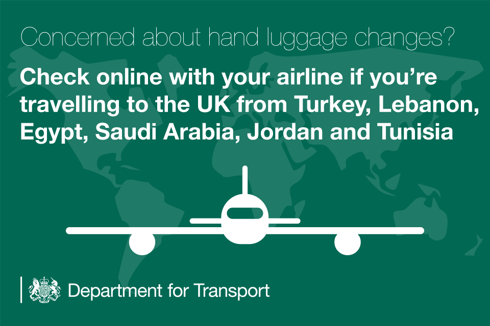 Transfer passengers who board a UK-bound flight on a route affected will be subject to the measures. If they have a large phone, laptop or tablet with them, it will need to be placed in the aircraft’s hold for the UK-bound flight. Passengers should check with their airline for further information.