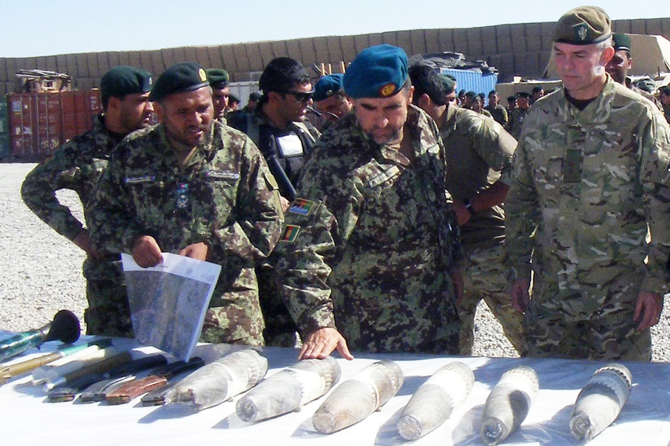 Brigadier General Mohammad Nasim shows Lieutenant Colonel Chris Davies the captured weaponry [Picture: Crown copyright]