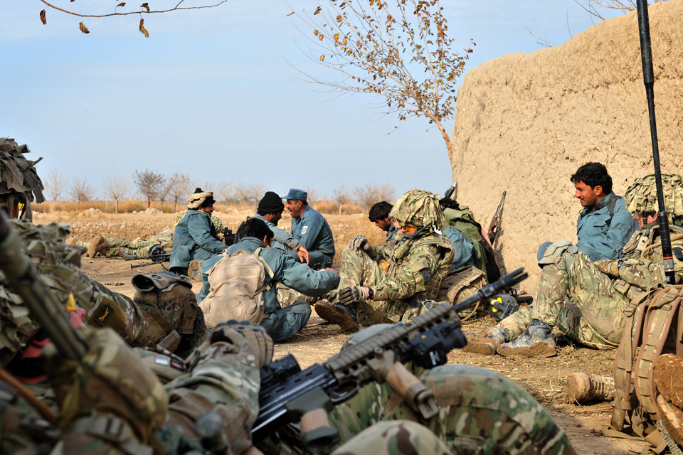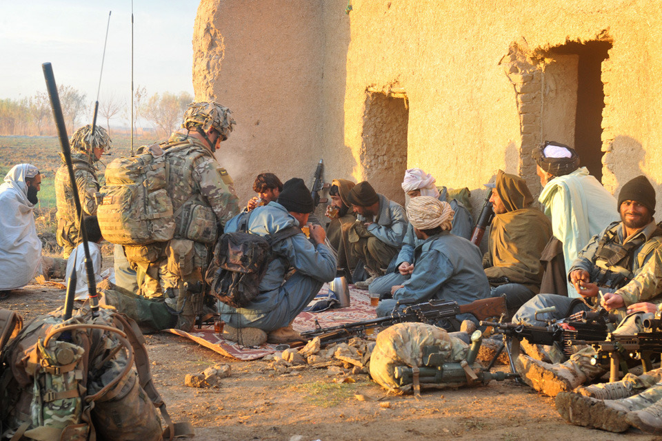 Members of the Afghan Uniform Police and soldiers of 1st Battalion The Duke of Lancaster's Regiment share chai (tea) with local elders [Picture: Corporal Mike O'Neill RLC, Crown Copyright/MOD 2012]