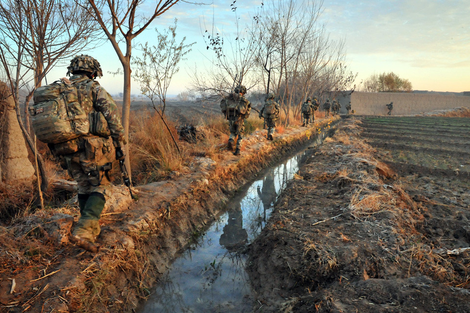 Soldiers of 1st Battalion The Duke of Lancaster's Regiment patrol alongside an irrigation ditch [Picture: Corporal Mike O'Neill RLC, Crown Copyright/MOD 2012]