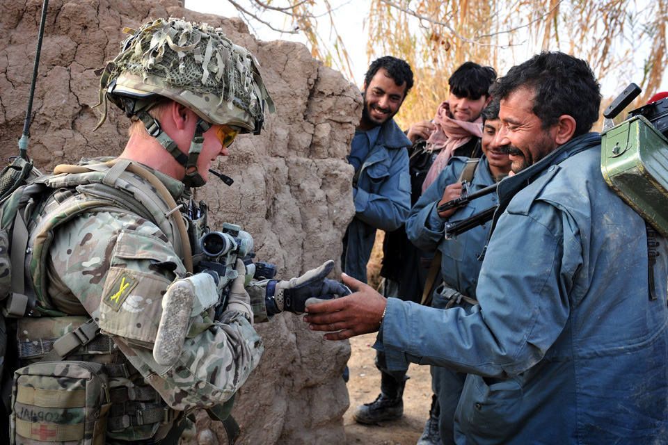 A soldier from 1st Battalion The Duke of Lancaster's Regiment shares a joke with members of the Afghan Uniform Police [Picture: Corporal Mike O'Neill RLC, Crown Copyright/MOD 2012]