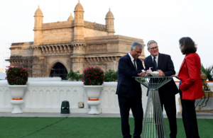 Prime Minister Keir Starmer speaks with Trade Commissioner to South Asia Harjinder Kang and British High Commissioner to India Lindy Cameron in front of the Gateway of India in Mumbai. Picture by Simon Dawson / No 10 Downing Street.