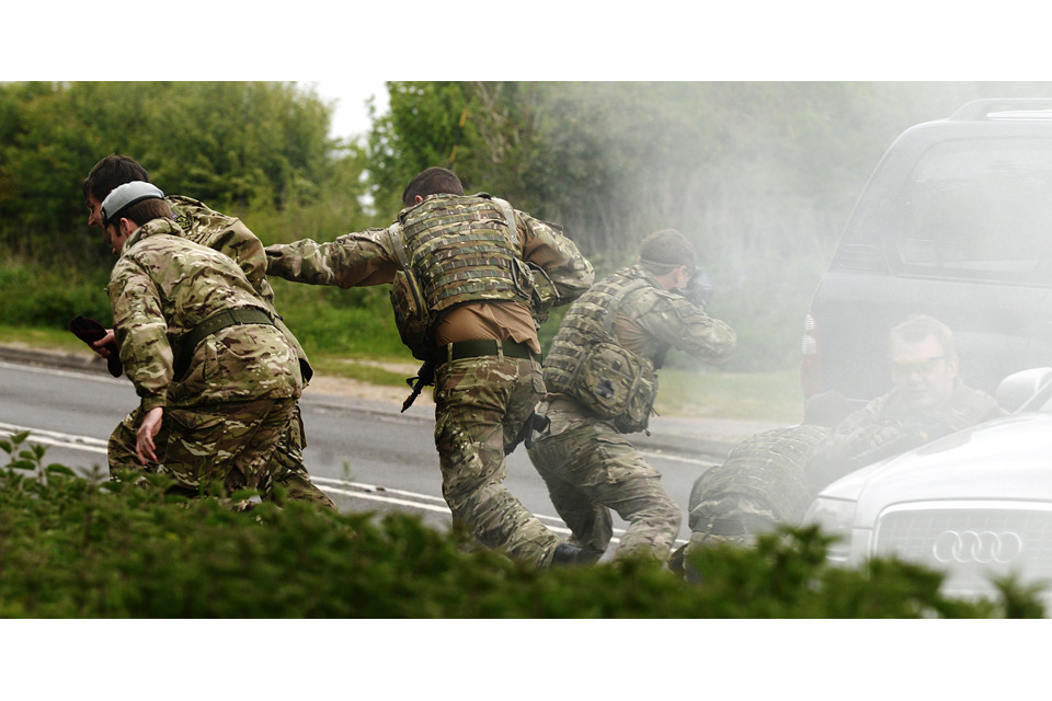 A simulated bomb blast and ambush test members of the 156 Provost Company Royal Military Police close protection team in Colchester [Picture: Corporal Obi Igbo, Crown copyright]