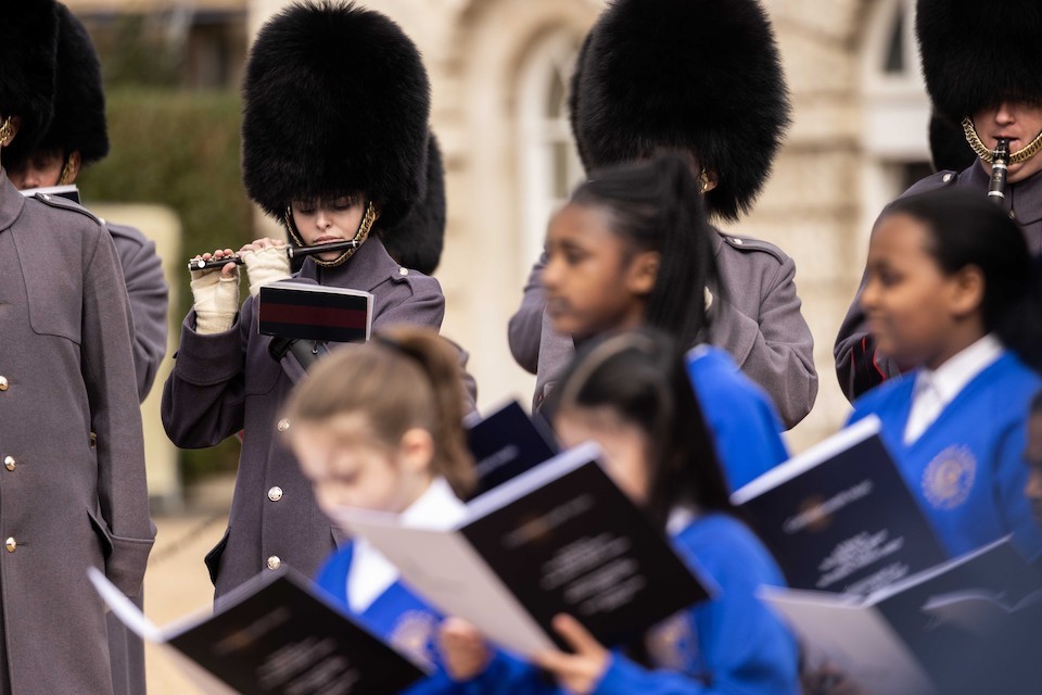 The Band of the Scots Guards with the Commonwealth Youth Orchestra and Choir perform at Horse Guards Parade, 14 March 2022. Crown Copyright.