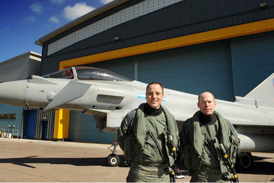 Squadron Leader Matt Peterson (right) and Wing Commander Roddy Dennis with an RAF Typhoon. They will take part in the Royal Wedding flypast [Picture: Senior Aircraftman Graham Taylor, Crown Copyright/MOD 2011]