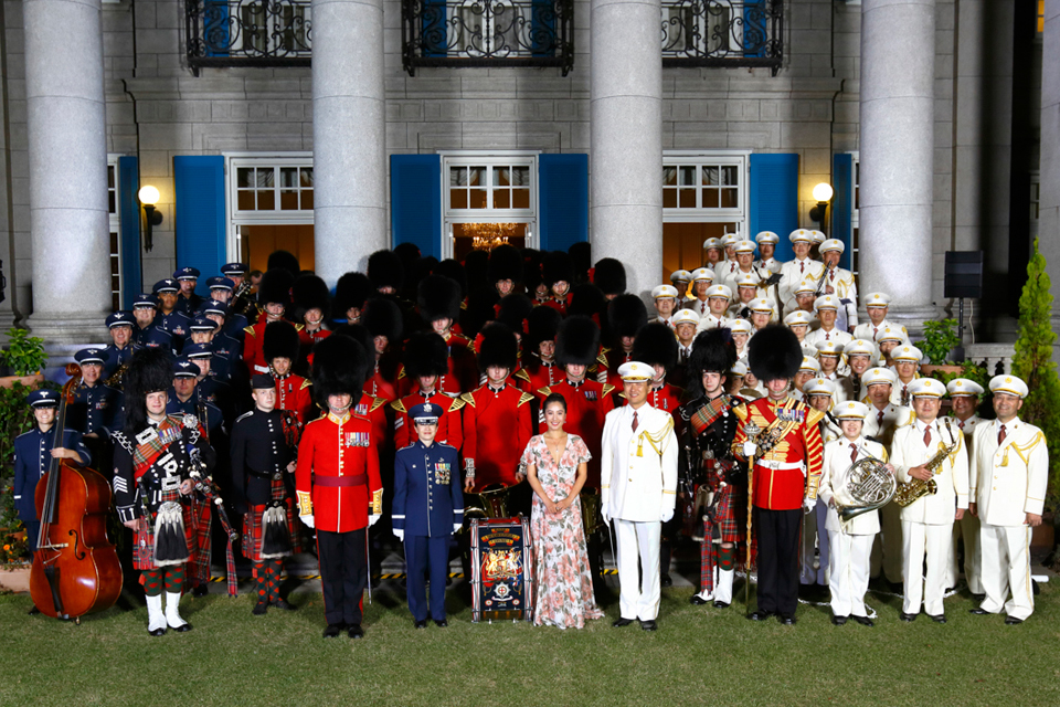 This unique event aimed to bring together colleagues from Japan, the US and across the foreign embassies in Tokyo in order to promote friendship and outcomes that can only be achieved through cooperation. Working closely with the UK Ministry of Defence, the US Forces Japan and the Japanese Ministry of Defence, three unique bands with their own style performed in seamless harmony together. The combined sound incorporated each group’s individuality whilst operating together with unified purpose, resulting in a spectacular and moving joint performance including Triumphal March, Yasuki-bushi, Blues for a Purpose, In the Mood, When the Guards are on Parade, King’s Guard, Amazing Grace and the national anthems of Japan, the US and the UK.