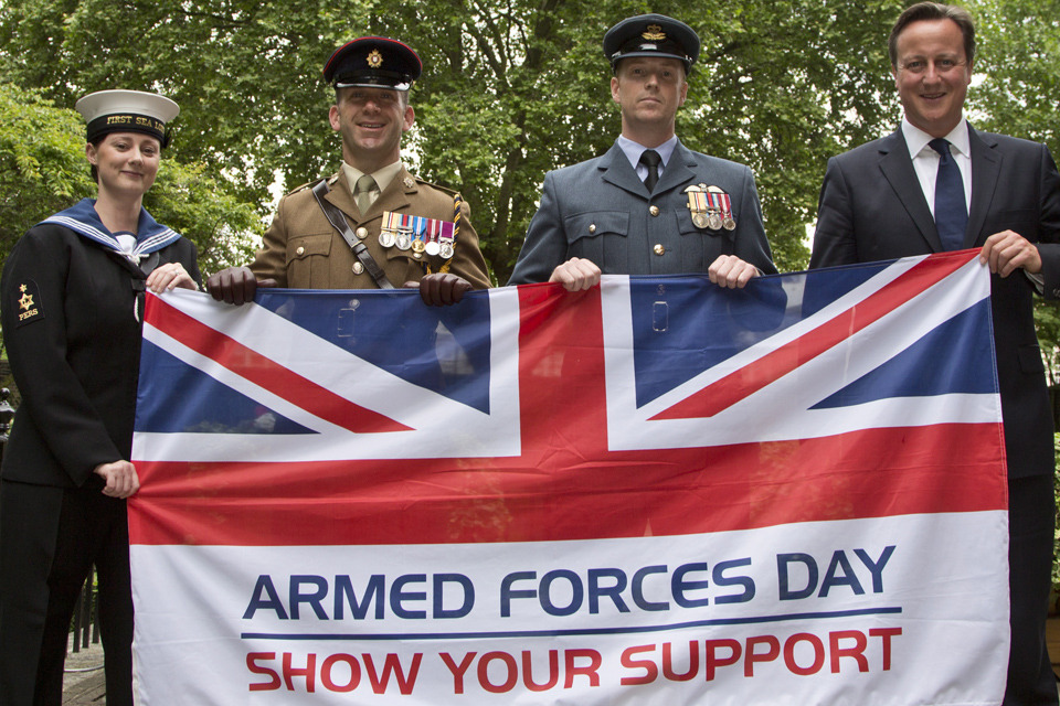 Prime Minister David Cameron shows his support for Armed Forces Day with personnel from each of the three Services [Picture: Petty Officer (Photographer) Derek Wade, Crown copyright]