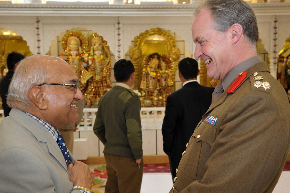 Brigadier Greville Bibby shares a joke with Dr Achhar Paul Dharni, President of the Shree Lakshmi Narayan Temple in Bradford [Picture: Corporal Gabriel Moreno, Crown Copyright/MOD 2012]