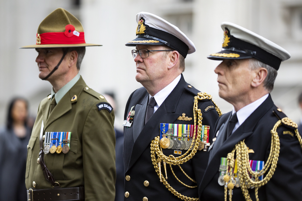 Representatives of New Zealand and Australian armed forces stand at the Cenotaph. Crown Copyright, All rights reserved.