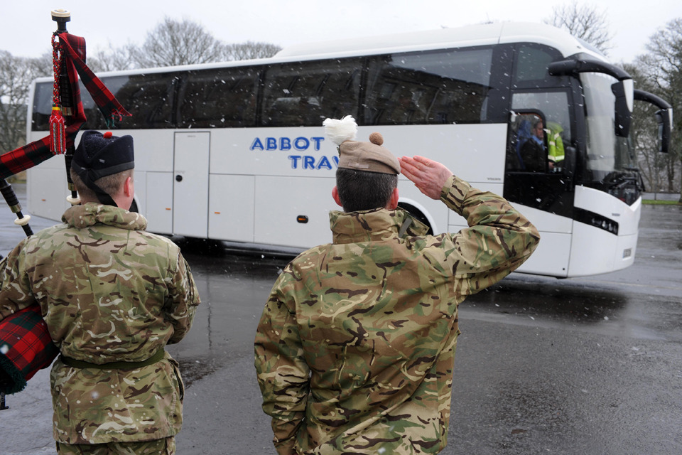 A bagpiper and senior officer salute the departing troops at Glencorse Barracks near Penicuik in Scotland [Picture: Mark Owens, Crown copyright]